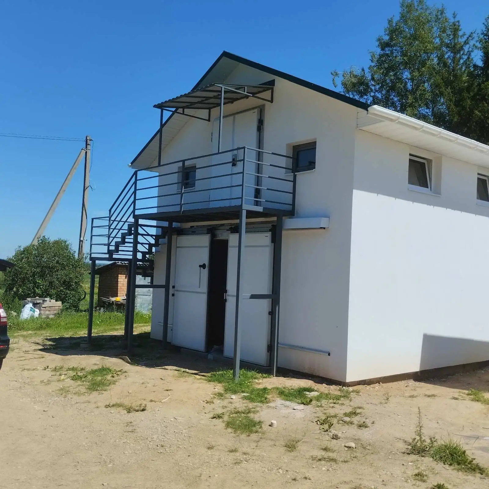 Чтобы решить эту задачу, для отдельного входа в офис на втором этаже мы установили наружную металлическую лестницу на второй этаж с площадкой, которая, к тому же, выполняет роль навеса над входом в складское помещение.